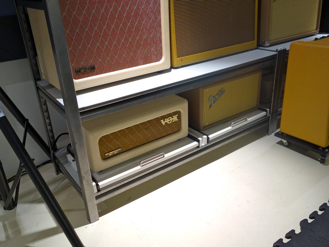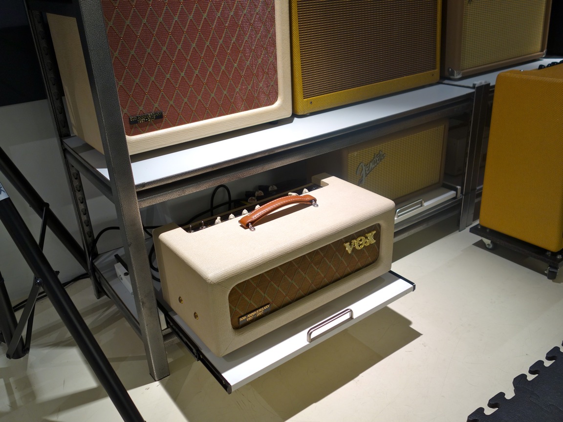 The Vox AC15 speaker sounded best and cleanest in my garage/studio when elevated, so I placed the cabinet on this shelf. The problem was where to place the head. Alongside the cabinet, the head took up space on the shelf. On the cabinet, the head was inconvenient to use, and there was risk of someone tripping on the guitar cable and pulling it off.