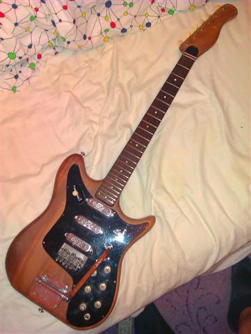 Here is is (as it looked originally) in 1965, It is the only one I've ever come across (apart from the prototype in Paul's book) that had a 'reversed' colour scheme (cream/black instead of black/cream) for the plate and pickguard. (That's me attempting a chord of G major).