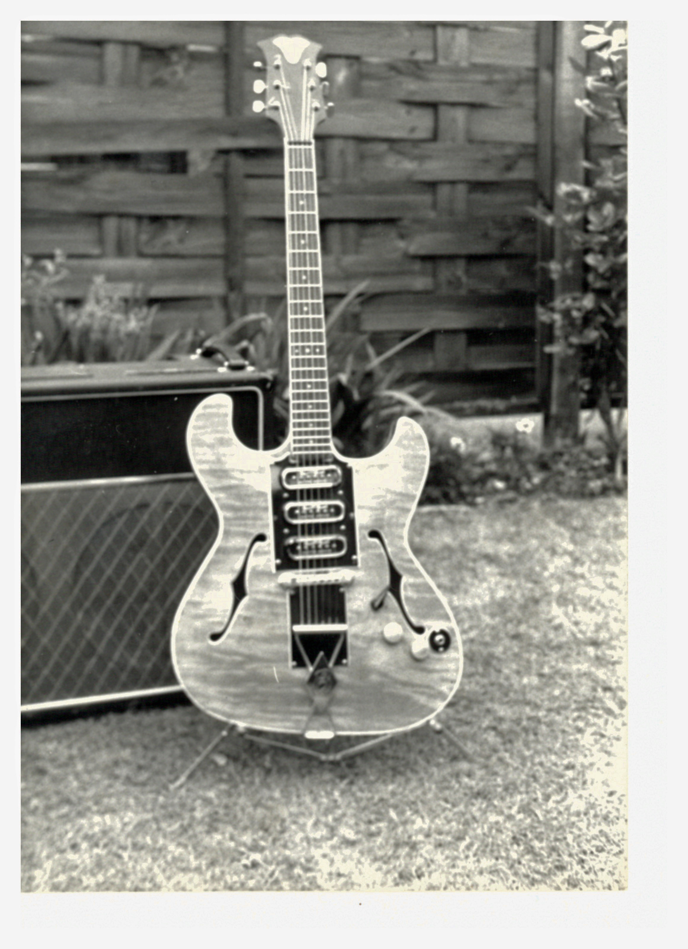 I was a Burns enthusiast back in the sixties and seventies. By 1976 I had owned a Vibra Artist, a smooth scroll Vibraslim, two Double 6s, two three pick-up Bisons, a 706 335 look-alike and my first Marvin. Then I came across this guitar (see photos) in a shop in London's Denmark Street. I had no idea what it was but it was a Burns and had a price of £45 on it. I bought it on impulse but found it to be unusable as a working guitar. Clearly it was missing various original parts (term unit) but it did have a very nice neck and low action. After a few months I got in touch with Paul Day who was very interested and swapped it for a three pick-up 1963 Black Bison. If you have a copy of Paul's "Green" Burns Book you will see this guitar mentioned and illustrated on pages 52 &54 as a prototype Mk2 Thinline. Paul actually used one of my photos in the book, modified (pre-Photoshop!!!!) with an illustration of what the term unit should have looked like. I thought those interested in Burns guitars might like to see the original photos which I just dug out of my archives and scanned in.