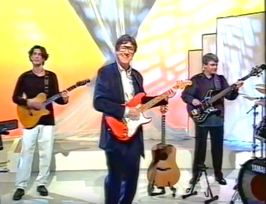 This low-quality photo is taken from a TV appearance by Hank (probably promoting his Hank Plays Cliff CD) and I am struck by the green Burns bass Mark Griffiths is playing (or miming with). I'm not sure which model it is, although I assume it's a Legend, but the toast rack has been removed, which I take to mean that Mark was using it for more than TV purposes around this time. I've never seen Mark as a Burns enthusiast so I wonder why? Does anyone know?