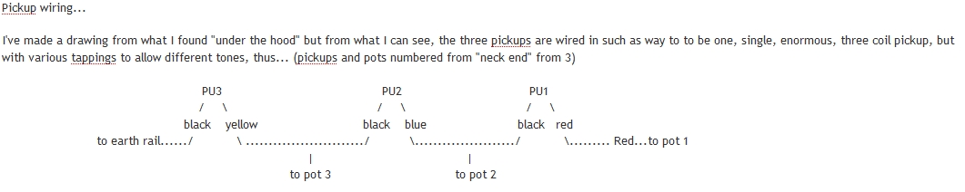 The closest I ever got was the picture below which my electronic friend drew up at the time I first took the pick guard off the Artist that you eventually bought off me. I've used this before on previous querries about the various combinations of sound these guitars produce.