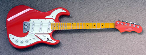Would your 'muddy salmon/pink colour' be what is described in the Burns catalogue of 2005 as 'Candy Red' ? The other standard colours for the Batwing were two-tone sunburst, Teal Green (ugh!) and Baby Blue.