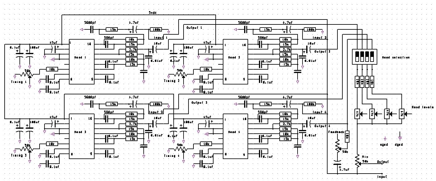 As a test to see if it is leakage of the clock signals causing the problem, try disabling all but one of the delay chips (e.g.pull them out of the socket) and see if the noise is still there from the one chip. If it is, get that one stage noise free before worrying about the whole lot. If the noise is reduced a lot, then it is the clocks causing the problem and you will probably need the inter stage buffers to help reduce it.
