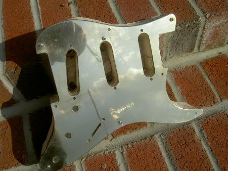 My Dad made me a scratchplate , brass and chromed, beautiful. We played on the tele and I noticed in the studio that when I caught the light with it it blacked all the monitor screens out. The technicians then sprayed the guitar ( Colorama) with a sort of wax which not only stopped the glare but damped all the strings, all the tone went. Happy days.