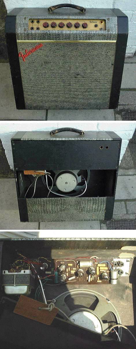 I had a great Selmer Selectortone Twin, in those days, & if it wasn't for the dire Hofner V3 electric solid I played, I would have sounded fabulous. I remember it had the console on the top, with a row of preset tone buttons & a side-mounted spring reverb, with a locking lever, for transportation. The amp itself was mounted in the bottom of the cab, & had one giant output valve. I think it was rated around 20 watts, & sounded really good with a decent guitar.