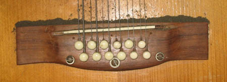 The pull of the strings was such that eventually the bridge started lifting. Lacking any glue stronger than Evo-stik, I decided upon an 'engineering' solution and held the bridge down with nuts and bolts.