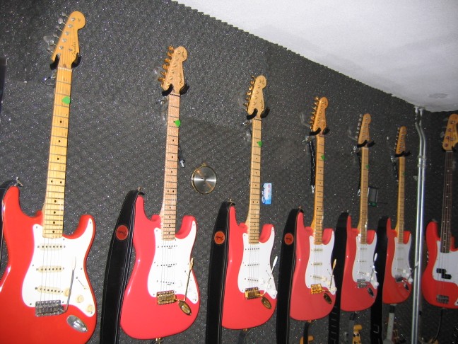 The most left one is a genuine fiesta red 58 strat and it's a pinkish one either....all others are suppoost to be fiesta red also....
