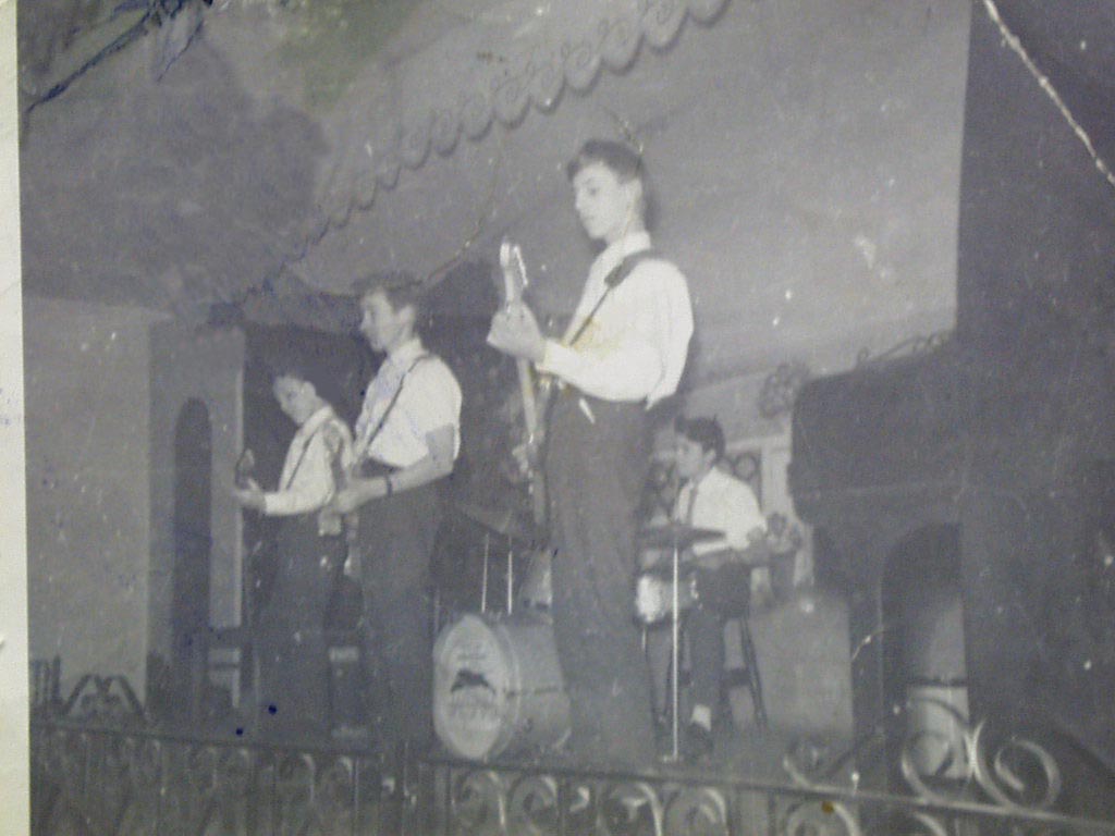 I'm in the middle playing lead on a pinkish Colorama that my Dad made a chrome scratchplate for through a Selmer 5 watt amp behind me, just visible through the legs of the piano