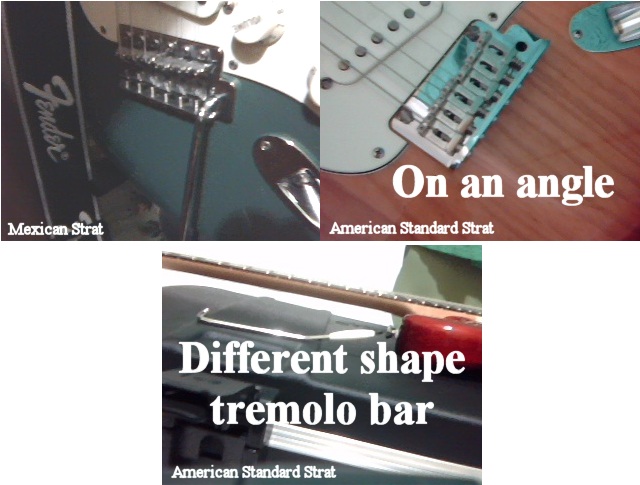 Although I'm very happy with my backup Mexican Strat the only thing I find difficult is the trem bar doesn't have as much room to move my hand as the American Strat and I noticed a few differences in the bridges and trem bars today as in the attached images.