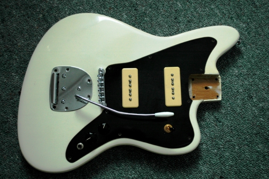 The seller wasn't able to help. Definitely a Jazzmaster clone trem and what I believe are P90 pickups.