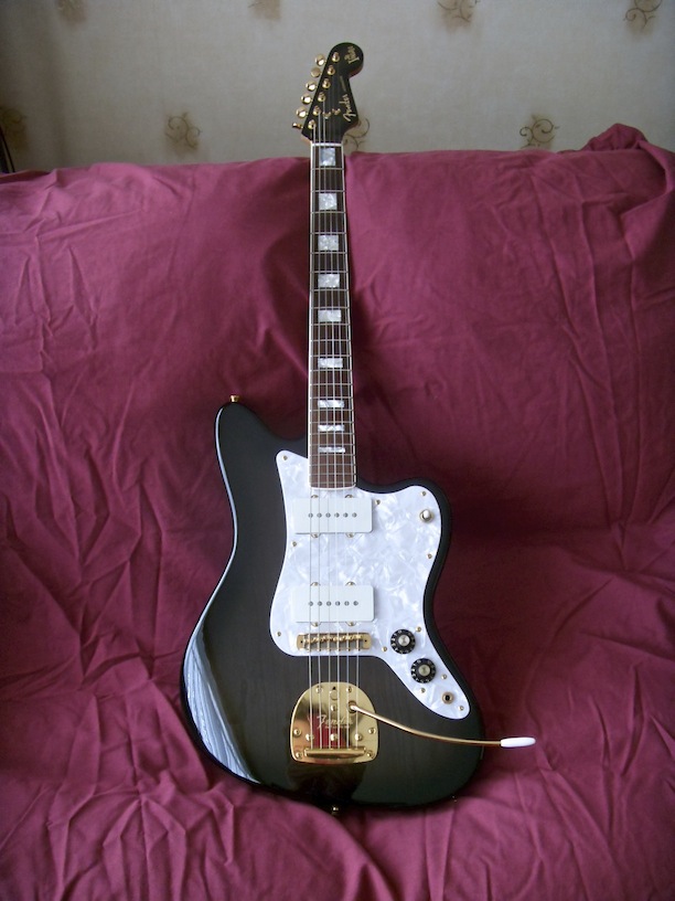 I wanted a Jazzmaster with the sound of the very early Ventures, specifically on Bob Bogle’s “Walk Don’t Run.” I decided to order one to the same specification as Bogles first guitar, which was probably a ’58 or a ’59. Anyway, Fender’s Customshop attended to the specification and after several months delivered this sunburst Jazzmaster, built by masterbuilder Dennis Galuzca. It is fitted with fat flatwounds. They said the guitar sounds more like the Ventures than they do now.