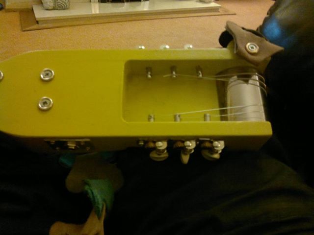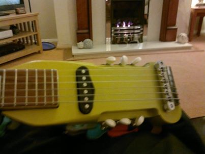 Gibbo type bridge, strat P/U. No volume control, jack socket on bottom edge. The strings go round the bottom of the body on a stainless steel semi-tube wrapped around a mahogany turned and shaped diameter piece. That should make for good sustain.