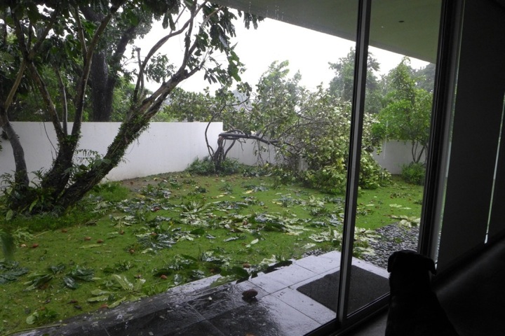 We are lucky to have some green and several trees. But typhoons are always a feature here, and they have been getting stronger. The typhoon last month knocked down several trees. This is how it looks after the last storm. That's our three-year-old dog, Sundance.