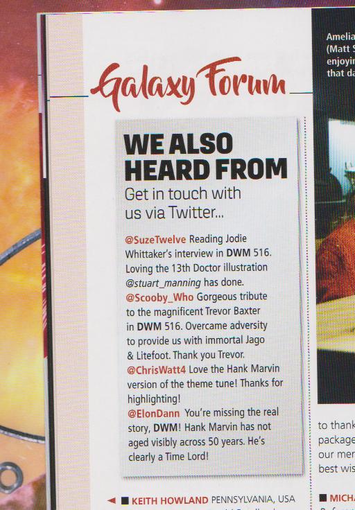The latest issue of Doctor Who Magazine (#517) contains a couple of tweets on the letters pages on the subject of their recent interview with the inimitable - and ageless -