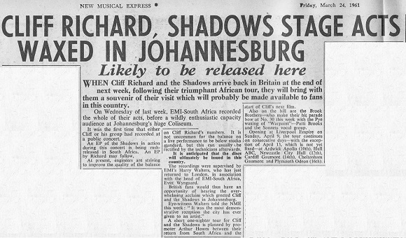 Bruce has said that they didn't want the Colosseum tracks to be released in Britain, but only in South Africa. It was their way of saying 'thank you' to the South African fans, so I don't think Norrie Paramor had anything to do with that decision. The recordings for the album "The Cliff Richard Show - Live At The ABC Kingston - 1962" had/have some technical faults on the master tapes, so that may have prevented the album from being released in 1962, but also the release of the "Summer Holiday" album.