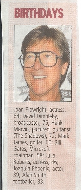 ...From our local paper. As these birthday announcements are syndicated I guess most local papers will have carried it - a few nationals too - but I wonder how many bothered to print a pic?