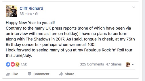 Contrary to the many UK press reports (none of which have been via an interview with me as I am on holiday) I have no plans to perform along with The Shadows in 2017. As I said, tongue in cheek, at my 75th Birthday concerts - perhaps when we are all 100!