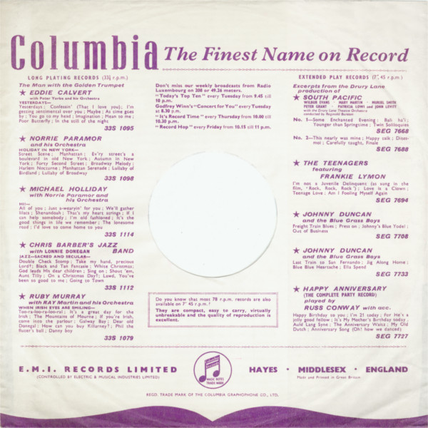 At first, there were no adverts on sleeves (this was with the 1960-pattern "Circles" design), then the Stripes design sleeves advertised a variety of EMI LPs on the reverse sides (1961/1962). The artists were Norrie Paramor, John Barry, Edith Piaf, Russ Conway, Shirley Bassey, The Big Ben Banjo Band (that's Norrie again), Victor Sylvester, Russ Conway, Alma Cogan, Manuel and the Music of The Mountains (Geoff Love), and Cliff Richard & The Shadows (one each). Only the titles and serial numbers were included in the ads,