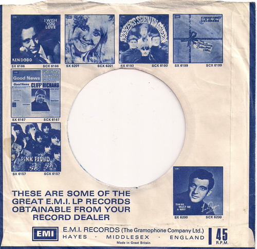 Tomorrow's Cancelled / Somewhere was released (summer 1967) in a white sleeve with small reproductions of the front covers of twelve EMI LP sleeves on the front and six more on the reverse. The reverse also had an ad for EMI record tokens. The LPs advertised on the obverse of the sleeve were by: