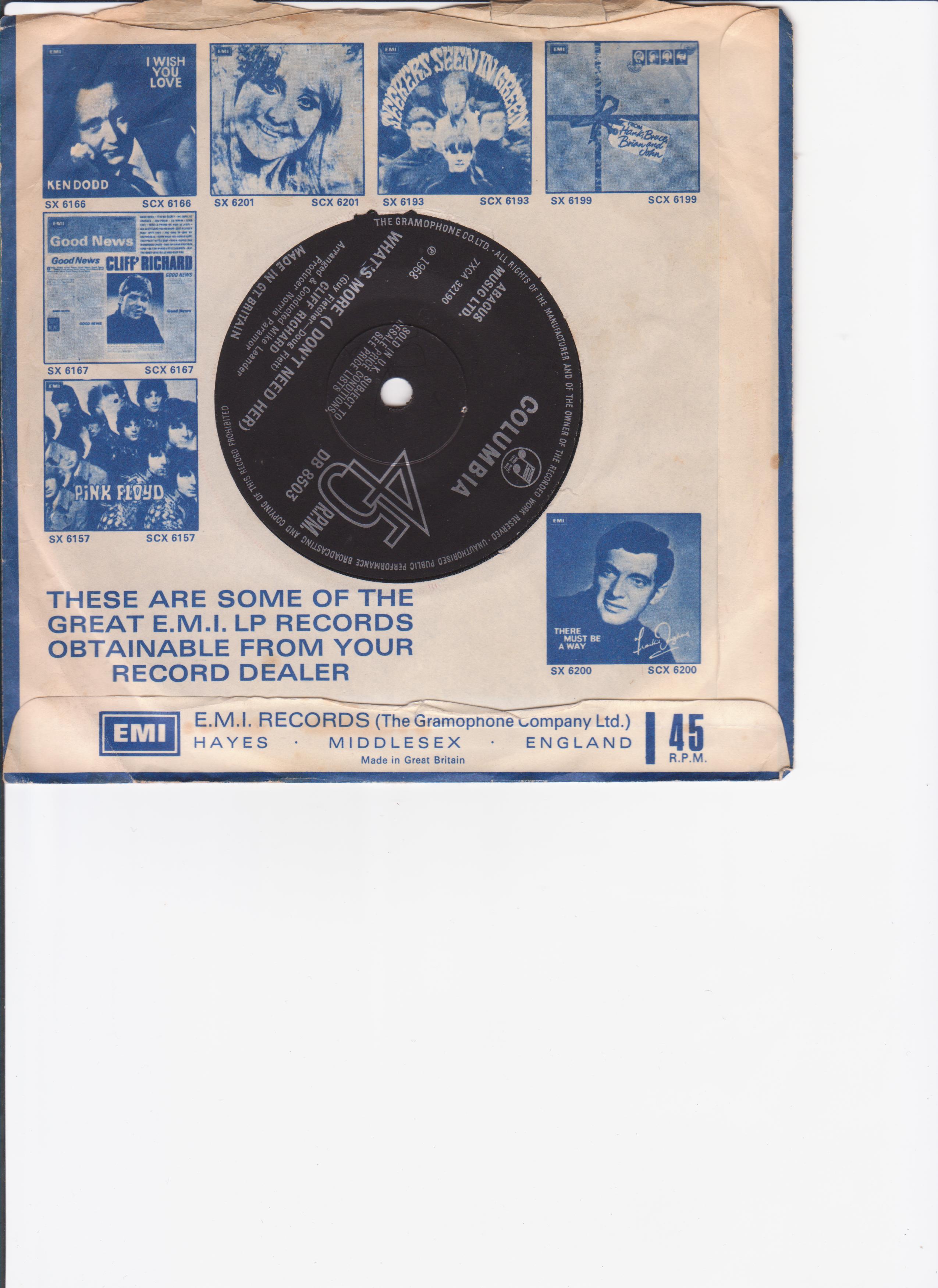 The well-remembered Morphy-Richards hairdryer advert appeared (on a red, rather than a green, sleeve) in 1966 on DB 7853 (I Met A Girl / Late Night Set). The Hair Dryer was priced at £3/17s/6d and the optional Salon Pack (whatever that was) was another £2/9s/6d. The same Morphy-Richards ad appeared on the red reverse of the sleeve for A Place In the Sun (DB 7952). I have never seen it appear on a green sleeve.