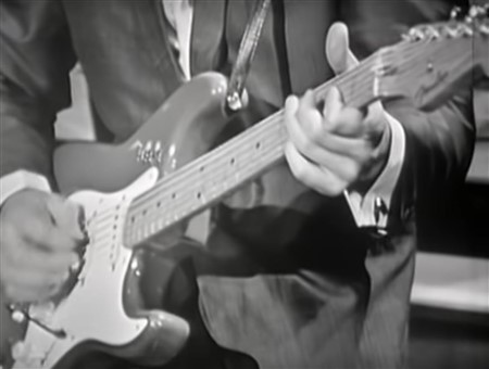 When I saw the Shadows at the Paris Olympia in 1961, Bruce was playing a silmilar Tele, I saw it with my own eyes, while Hank was playing the red Strat and Jet a sunburst PB. All had unmiked Vox AC30.