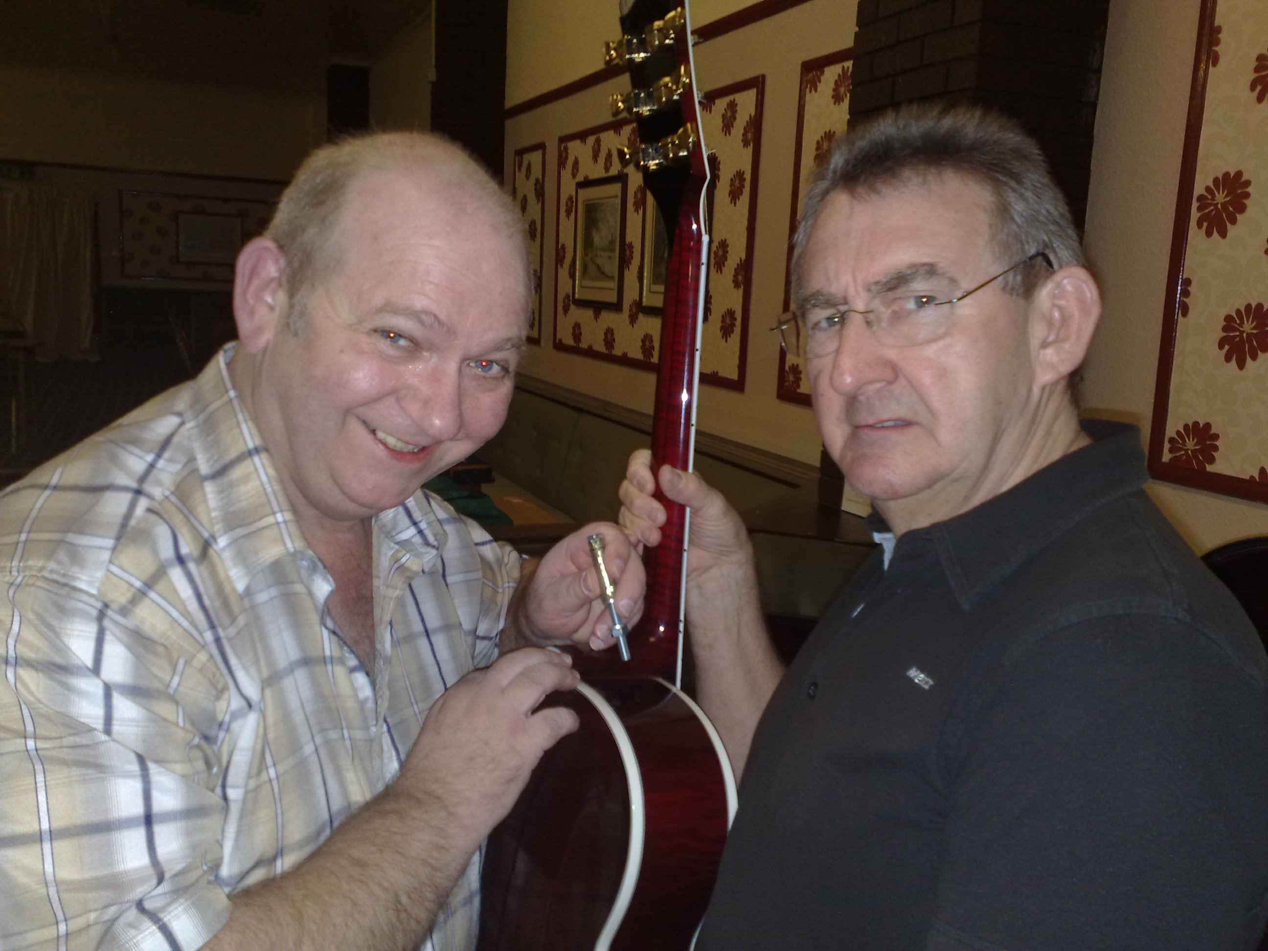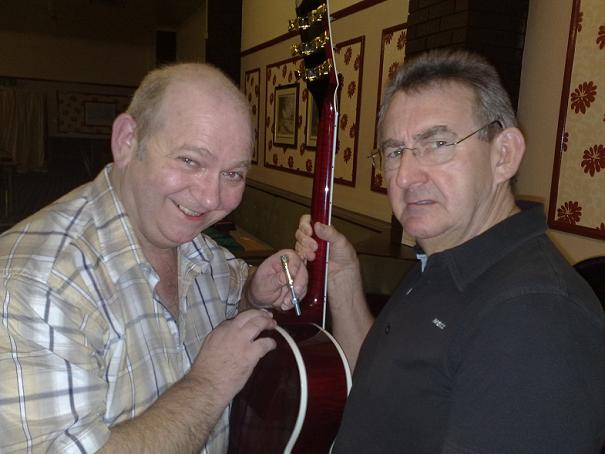 Here's Mr Alan Bakewell showing me how to fit the Gibson Rawbolt strap button last night at the Hankies meet.