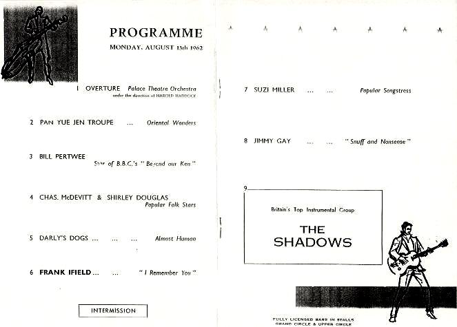 Brilliant work Heinz. Thank you. Not that I saw the Shads in 1962 - but fascinating to see that programme. Suzi Miller - beloved of children growing up in the 1950s from her regular appearances on Children's Favourites singing "Bimbo". Good to see that Captain Haddock was on the bill too. LOL. :D