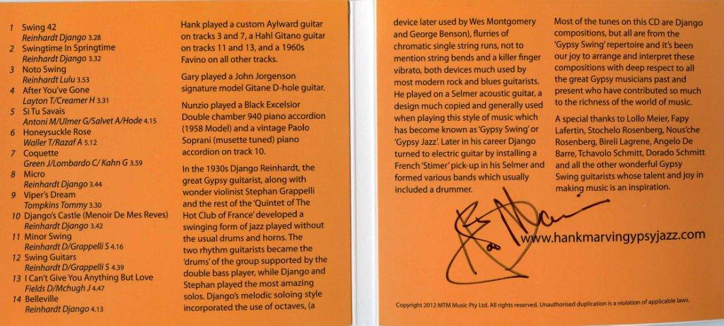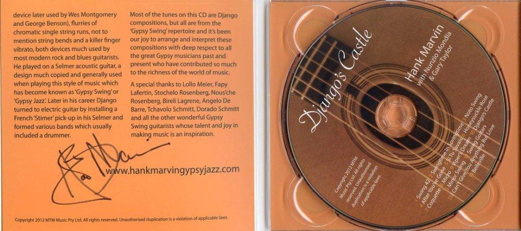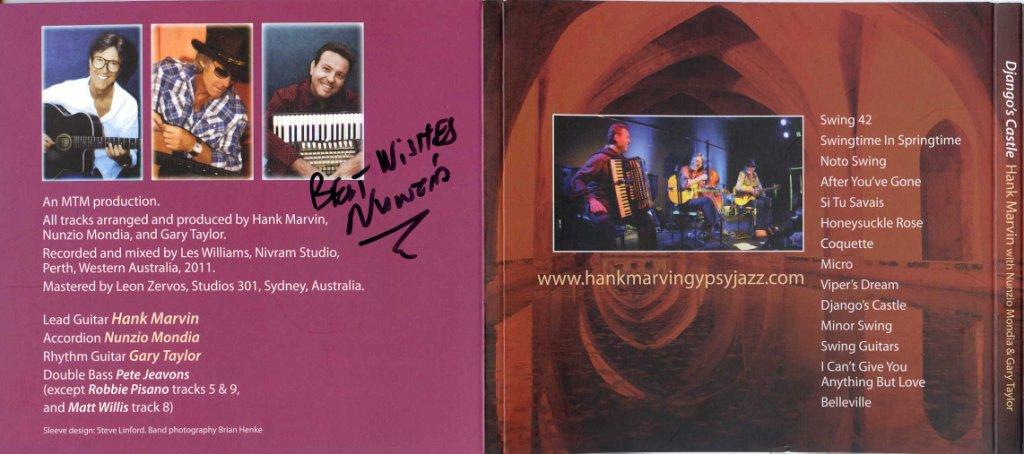 My brother in law who lives in Perth, Australia went to see Hank in concert play Gypsy Jazz about 2 weeks ago. He bought me a copy of Django's Castle and got both Hank and Nunzio to sign it(pity he didn't get Gary Taylor to sign but you can't have everything). It was delivered tonight by my neice who flew over here yesterday, so looking forward to a good night of music