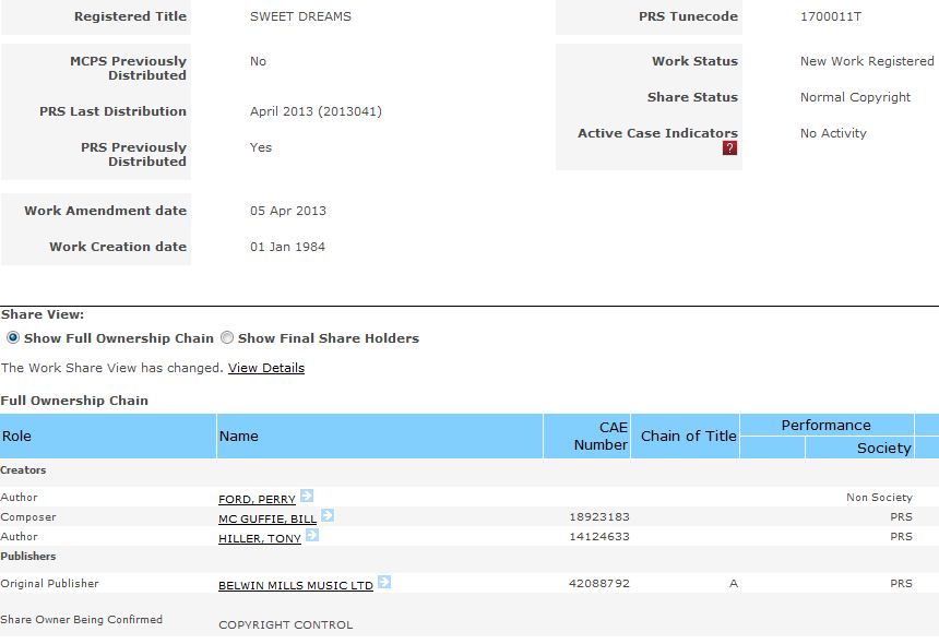 Intriguingly, there's a PRS database entry for McGuffie's "Sweet Dreams" with lyrics by Perry Ford and Tony Hiller, no doubt the same tune but never actually issued on commercial disc.
