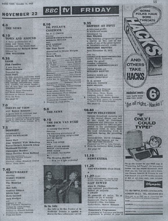 My memories are pretty vivid.....but are they correct? I had two fairly long walks, punctuated by a 20 minute bus ride - this being my usual journey home from grammar school in the 1960s. The first part definitely happened. We'd recently acquired a young dog, but there was seldom anyone around to walk it during the day. Result (accidental boisterousness)....it had knocked over and wrecked the family christmas tree, decorations and such like. After a few minutes attempting to clear up and repair some of the damage, I changed out of my school uniform and took the dog out for a c. 20 - 30 minute walk. By now it was past 5 O'clock and I had to make & light a coal fire (no central heating) from scratch. Now...my memory is that I then switched the television on - expecting to find "Crackerjack" or something similar on BBC - but there was.....nothing....just the spinning globe with solemn classical music in the background. I can't remember if I switched channels to ITV & what was on (or not) there. This would be c. 5.30pm. I was puzzled. 11 years old...I knew that, if there had been a technical problem...the Test Card would be showing & the music would be 'poppy' or lively or easy listening. The music (after a few minutes) was interrupted by a formal announcement that president Kennedy had been shot by an assassin and that he was in a critical condition. Like everyone at the time....I was shocked. So...my memory is that the BBC had cancelled the pre - main news programmes, partly as a mark of respect & partly to bring any news directly - as & when. Later that evening - I seem to recall hearing the awful news that Kennedy was dead on the BBC news (extended programme?). This was in Nottinghamshire. What a weekend. News of JFK's death on Friday 22nd and the first episode of Dr Who (which I did indeed watch) on Saturday 23rd. Even at the time I do recall the Radiophonic Workshop theme music and weird visual FX (opening & closing title sequences) being faintly weird and slightly disturbing. But.....did the BBC halt the transmission of children's programmes (c. 4.00pm - c. 6.00pm) that Friday evening?? Jim?? Anyone??