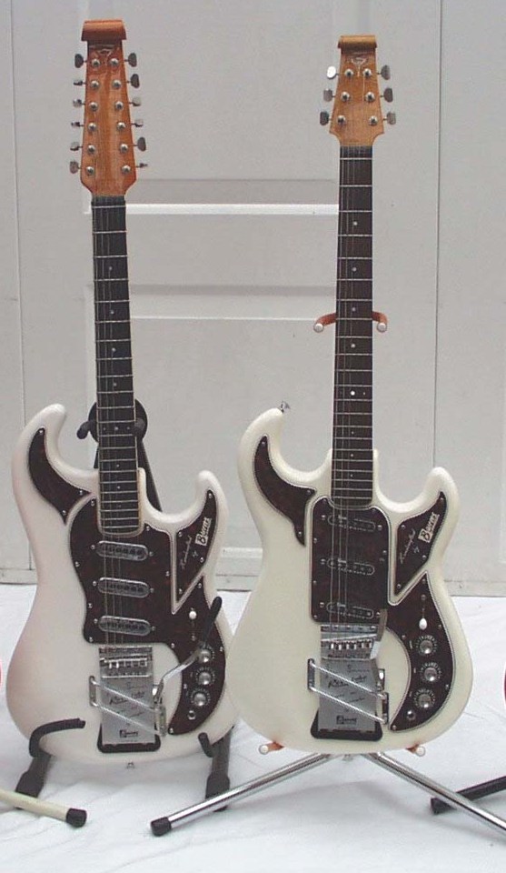 This my Double Six, hand built by Barry Gibson around 1998, Rezotube tremelo and a headstock scroll. Burns Legend (Marvin) at side for comparison. Fabulous machine!