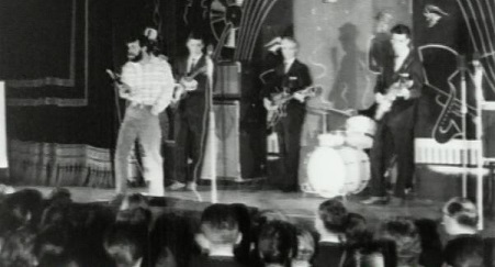 This image was taken from a clip of BBC news footage of the performance by Royston Ellis, accompanied by the Drifters (still, just) at Battersea Town Hall on 30th July, 1959, one of a series of Thursday "jive-nights" for teenagers staged by the local authority! Bruce is playing his Vega, Jet with Framus, Hank with the new Strat, Tony with Premier (?) kit.