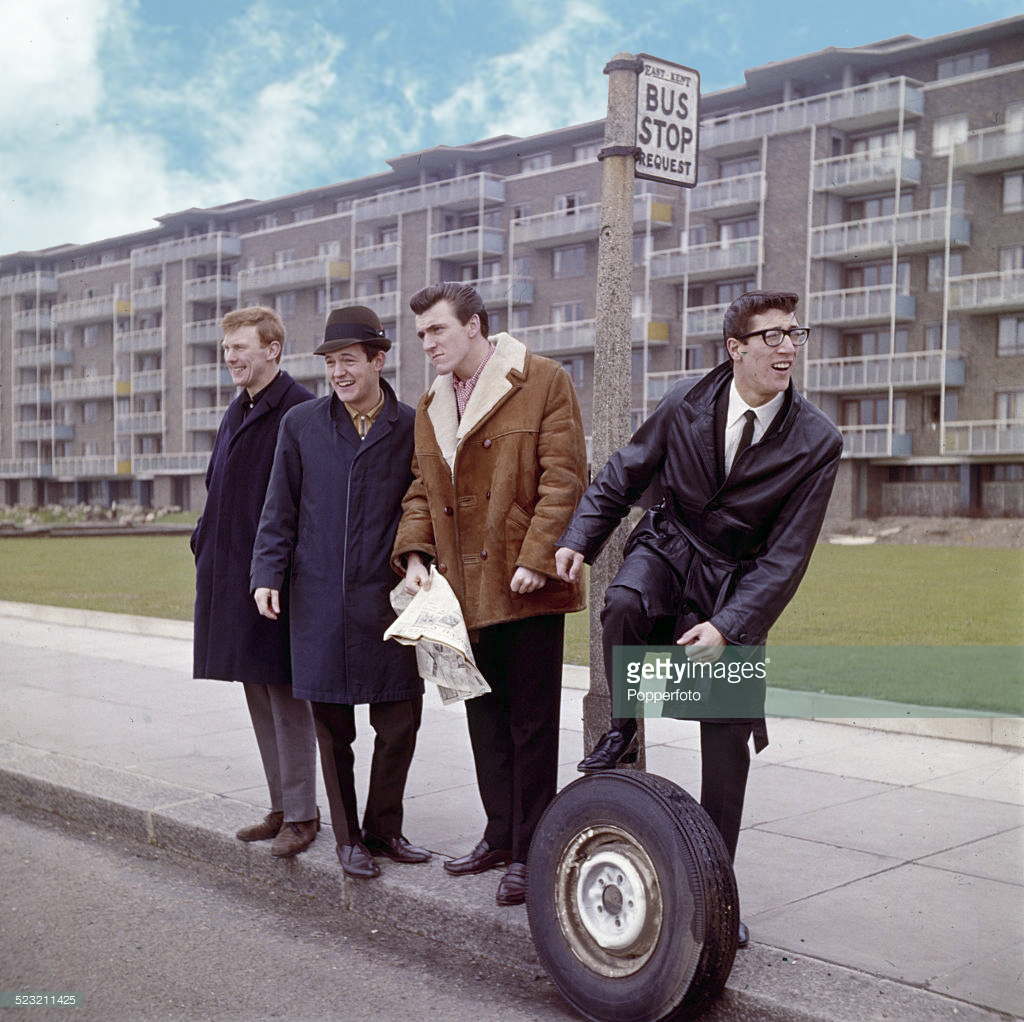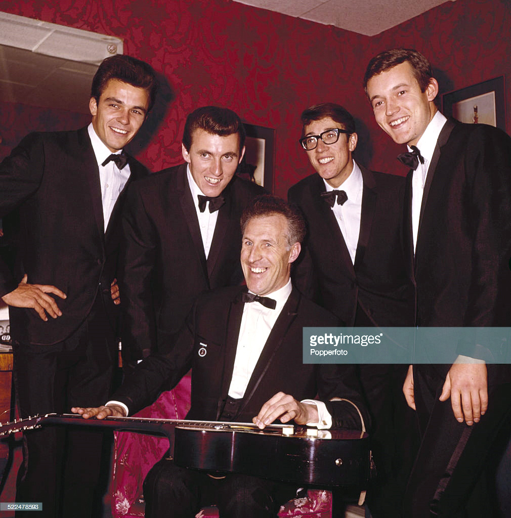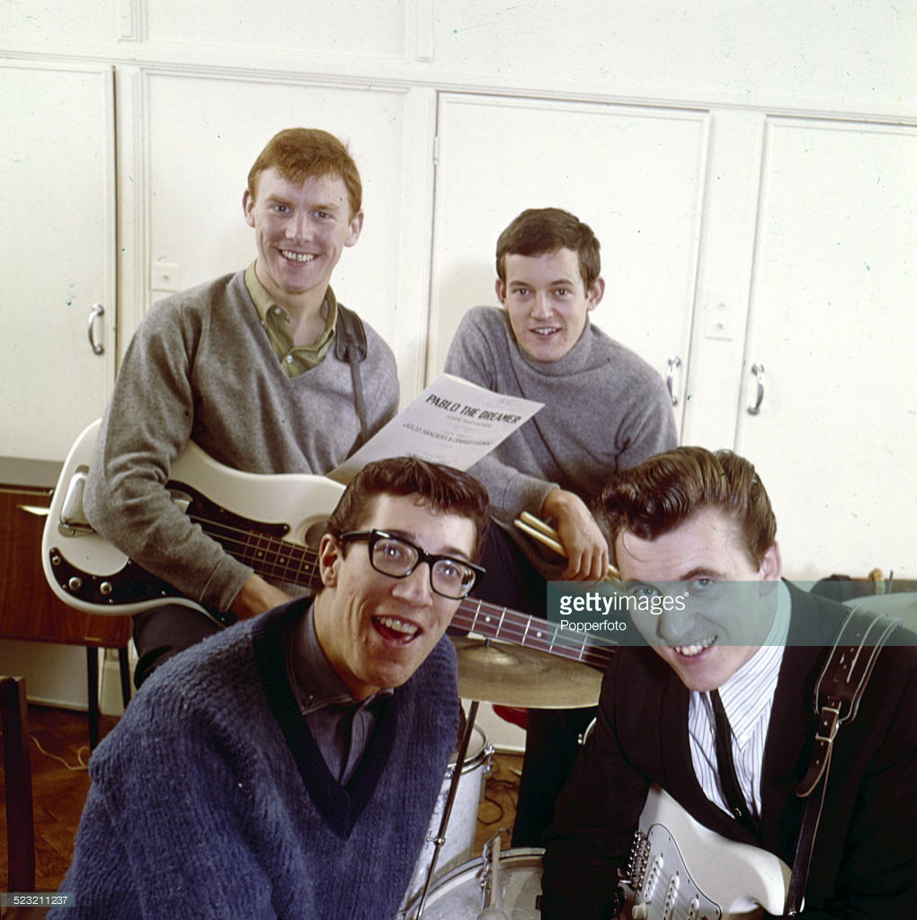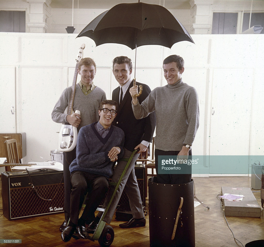 The Shadows The Absolutely Essential 3 CD Collection has a cover picture with Hank and Bruce playing white, tortoise shell Strats (rosewood neck) and Brian playing a similar white P bass. Looks like they were playing live.
