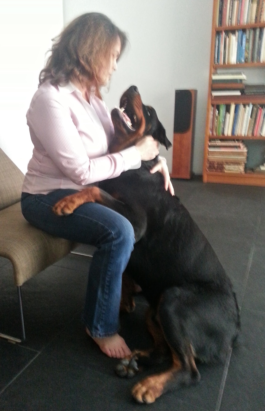 Here’s our bass guitarist Anna at my home with Sundance the Rottweiler. He's one good reason I would never leave a guitar on a stand in the living room.