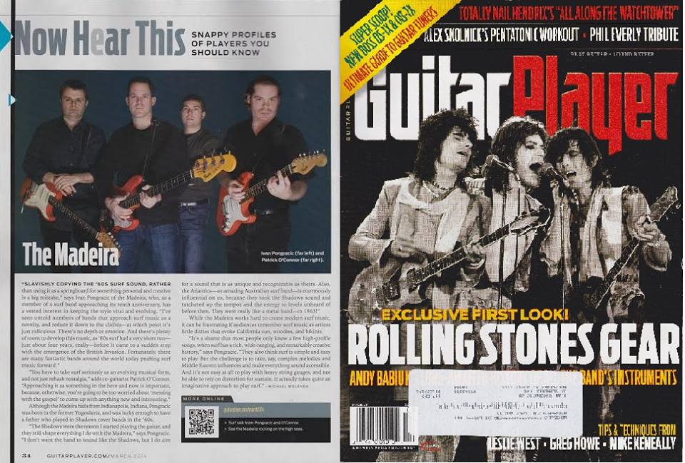 Just thought I'd share this with you. My surf band the Madeira is featured in the current (March) issue of the Guitar Player magazine, posing with matching fiesta red Fenders AND singing the praises of the Shadows! I thought some of you might enjoy seeing this.