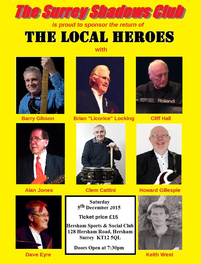 The Surrey Shadows Club, which is sponsoring The Local Heroes Show on the 5th December, are in the process of producing the poster for the show, which will be placed on this website and that of the Hersham Sports & Social Club.