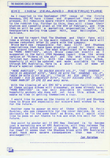 I've just managed to win a demonstration copy of the 1985 New Zealand compilation LP "More Rarities". I didn't know (but could have known via Malcolm Campbell's book "The Shadows At EMI - The Vinyl Legacy") that the promised single version of "Riders In The Sky", actually is the album version of the track. I have a question though: Malcolm Campbell in his book "The Shadows At Polydor - The 1980's And Beyond", on page 107 refers to the 1988 SCOFA 17 article, page 20, which describes the EMI tracks on the "More Rarities" LP as not quite as satisfactory as the six Polydor tracks. Does anyone know what exactly is not satisfactory about those tracks?