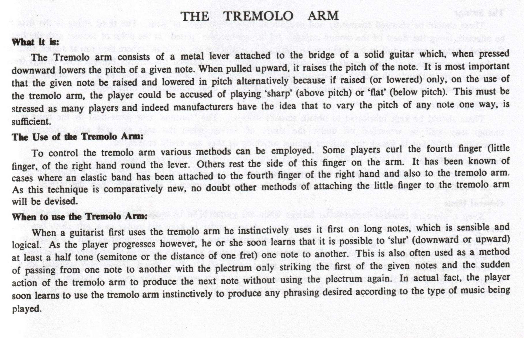Seems to overcomplicate things does'nt it. First time I had a tremolo, I just used it to get the sound that I desired as I had all the Shads tunes in my head. It just came natural to me when playing, I dont ever remember thinking, how do I use this thing???