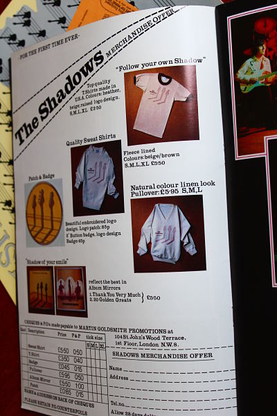 There is a merchandise page in the Shads 1979 tour programme which includes 20GG badge and patch and mirror, as well as a T-shirt, sweat shirt and pullover with the 20GG logo and what looks like The Tour 79 printed on them. To be honest, from the photos, the printed clothing doesn't look that good. I do remember the belt buckle as well and have a feeling that there may have been a similar merchandise sheet for the 1977 tour as well. Mind you, the page in the 1979 programme proclaims, "For The First Time Ever - The Shadows merchandise offer" - so exactly how much of this was available in '77 I can't imagine. Probably very little.