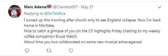 Anyone spot Bruce at the Test Cricket last week with Tim Rice? The camera panned over them for about 5 seconds then went back to the play. not even a mention from any commentators. It was like they new who Tim Rice was but didn't mention it because they probably didn't know who Bruce was.