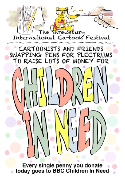 This year I have organised a musical Children in Need event in Shrewsbury, in association with The Shrewsbury International Cartoon Festival (which takes place every year in April). Myself and a few fellow cartoonists and associates will be providing a mix of music including some blues and folk but, mainly, Shads and similar instrumental guitar numbers. If you happen to be in or near Shrewsbury this Friday, 19th November, please come and support us. We are in the Darwin Centre (the blue carpeted area on the lower floor, near to T K Maxx and the exit to the car park), from around 9.30am until approx 4.00pm.