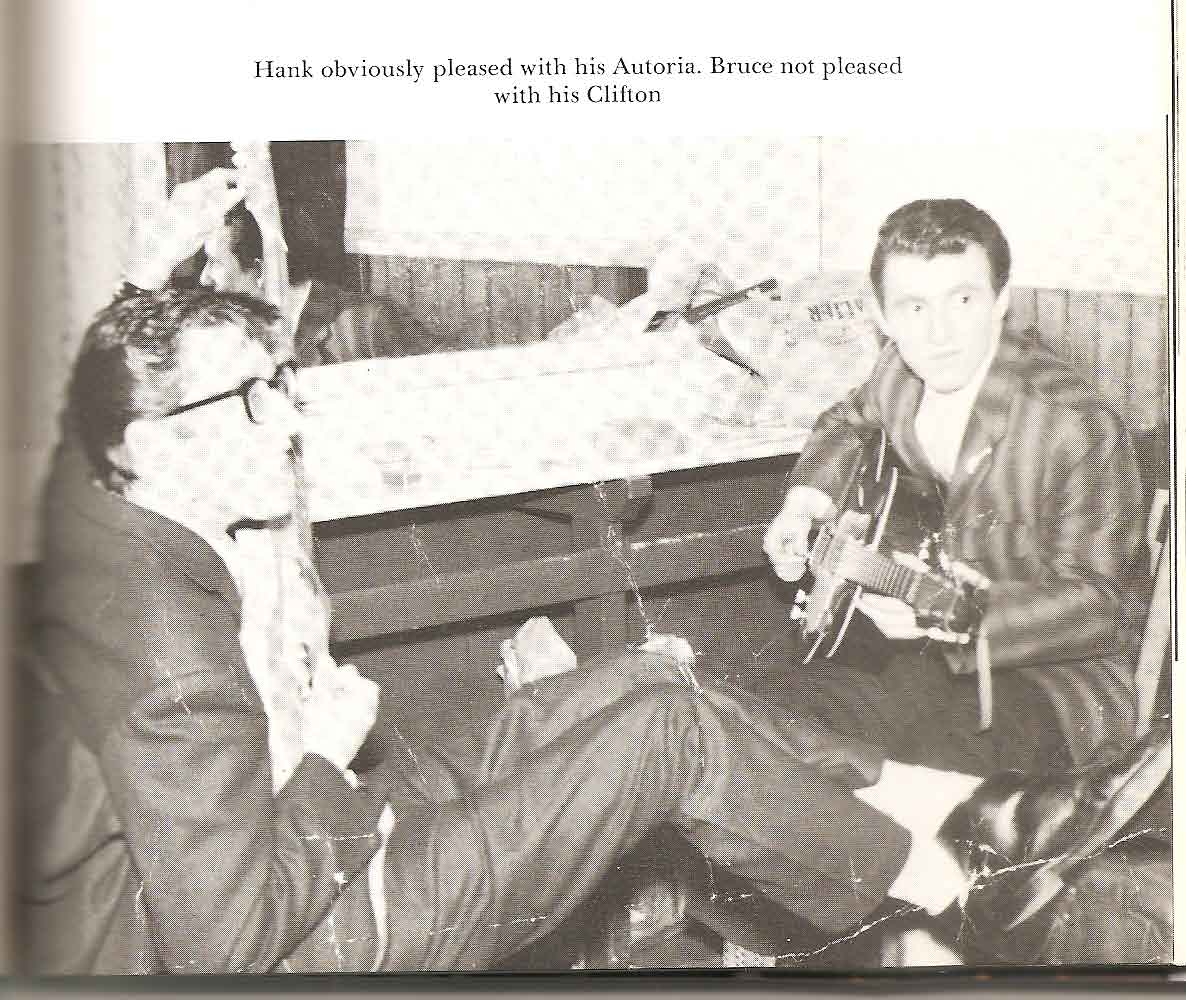 Great pictures that I've never seen previously... Hank's Autoria!! It seems Bruce played a variety of F-hole cello guitars during the 1958-59 period, and this one is not the Vega (with the white triangular pickguard) or, indeed, the guitar he's playing standing on the coffee table!