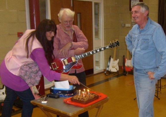 At yesterday's meeting of the West Of Wales Shadows & Guitar Club, we celebrated our fourth birthday! Not bad going for a small club in an out-of-the-way location. Doreen, on the left of the picture, baked a lovely walnut birthday cake in addition to the usual gateaux that she provides every meeting.