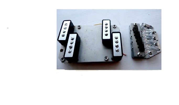 As Ray states, the body you picture is indeed that of a Hayman bass, this being confirmed by the shape, pickup cavity placement etc., and this brand's four-stringers weren't blessed with the 'benefits' offered by the Vibrasonic chamber. Regarding the photo of the Hayman guitar bridge, speaking from memory (as it's a while since I dismantled any Hayman), I believe that the extra plate shown fits beneath the actual saddle carrying section, as the diagonally arranged holes do correspond to those going through the latter, just behind the individual saddles.