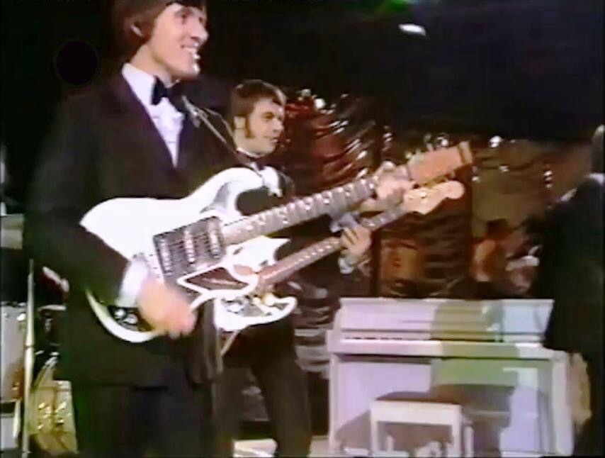 I think this is a screen grab I made some time ago from the Pop Goes The 60s video. I was just trying to capture the way Bruce and John worked together. As it turns out, the two head stocks align so that you can see the Fender.