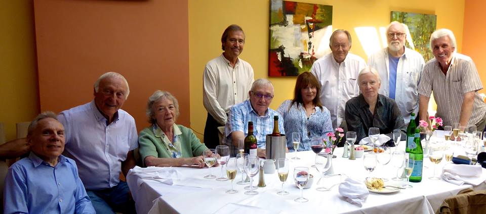 Brian and Bruce at Clem Cattini's 80th birthday bash recently. Looks like Mo Foster was also there... (Also, the man second from the left looks like Cliff Hall, although I'm not certain that it is.)