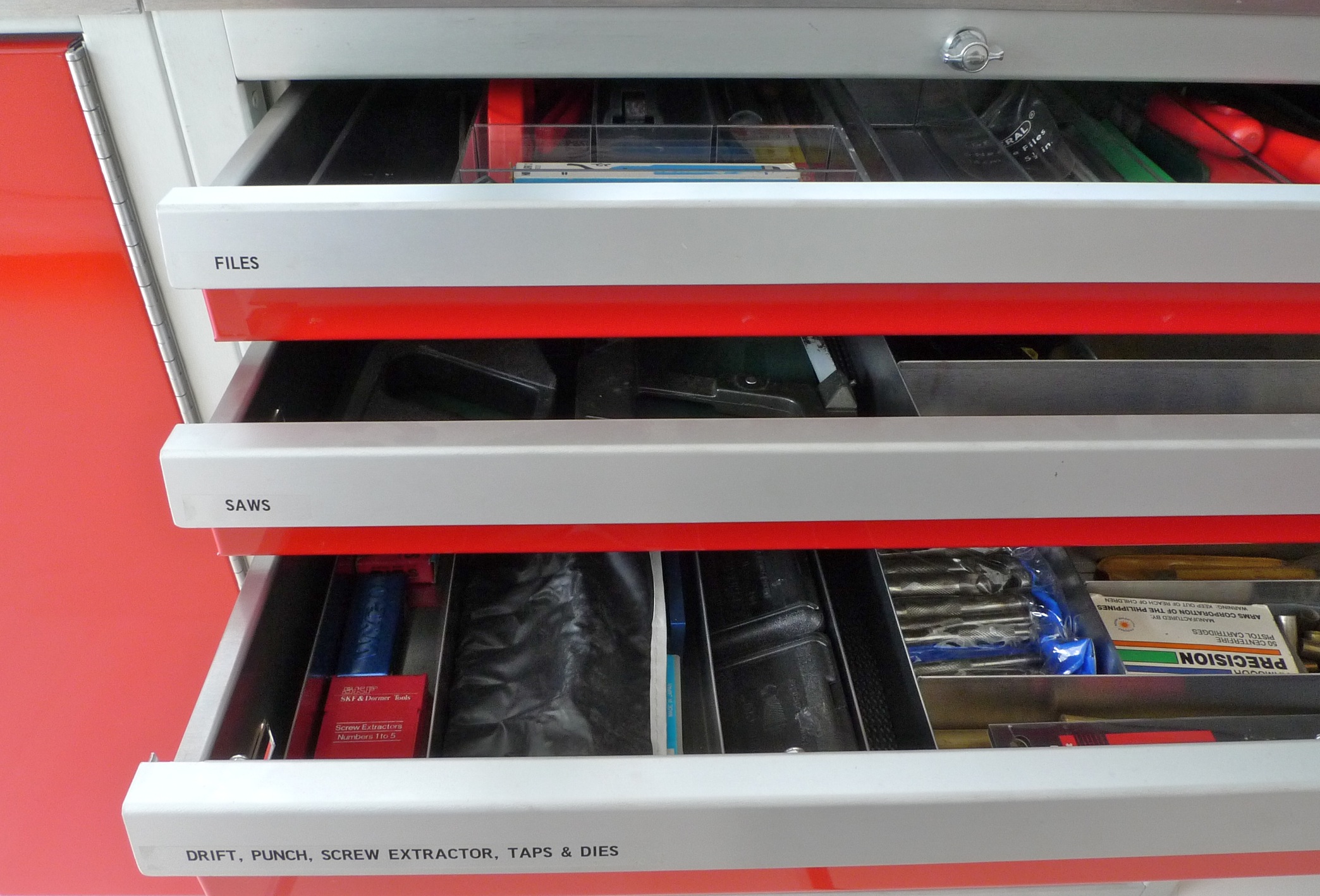I am not sure if you meant the label makers available at office-supply stores, Eric. I have used those for some years in my workshop. The new ones are very good. You can choose fonts and font sizes, colors, clear or transparent tape, and so forth. They have white or black letters on transparent tape, for instance, as shown on my tool drawers below.