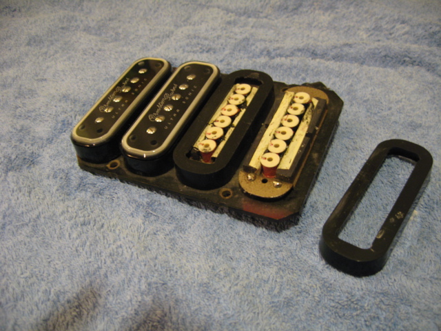 To complete the picture please see attached of the four pickup configuration showing the rows of six coils positioned under each string, sandwiched between the two rows of four magnets (secured by the white tape).